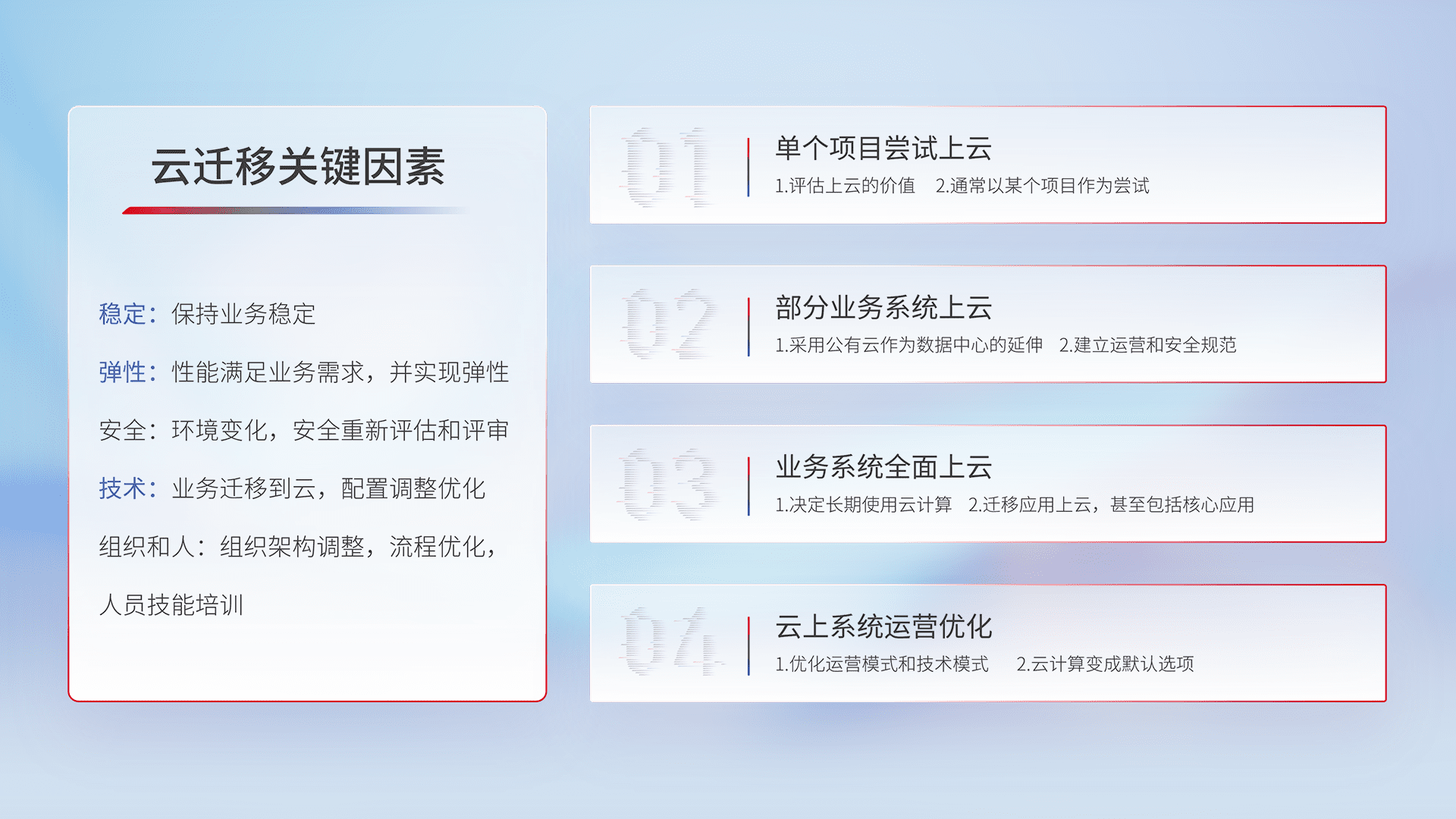 结合实际业务,,,,从规划设计、、、、云平台选型、、云原生改造、、数据迁移、、集成交付,,迁移全过程为客户识别最佳上云路径,,,做好风险识别管理,,,,设计网络架构、、、、身份权限、、、、安全审计合规、、、、操作审计、、日志审计、、、、监控告警策略、、、多站点容灾设计等,,,,对云上基础设施进行整体规划,,,,提升IT治理水平,,以满足弹性、、、、高可用、、、高性能的需求。。。
